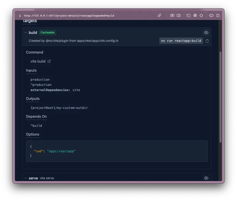 Notice the options property defining the names of the potentially inferred targets for each plugin. These targets will be generated dynamically s.t. you can still run nx build reactapp